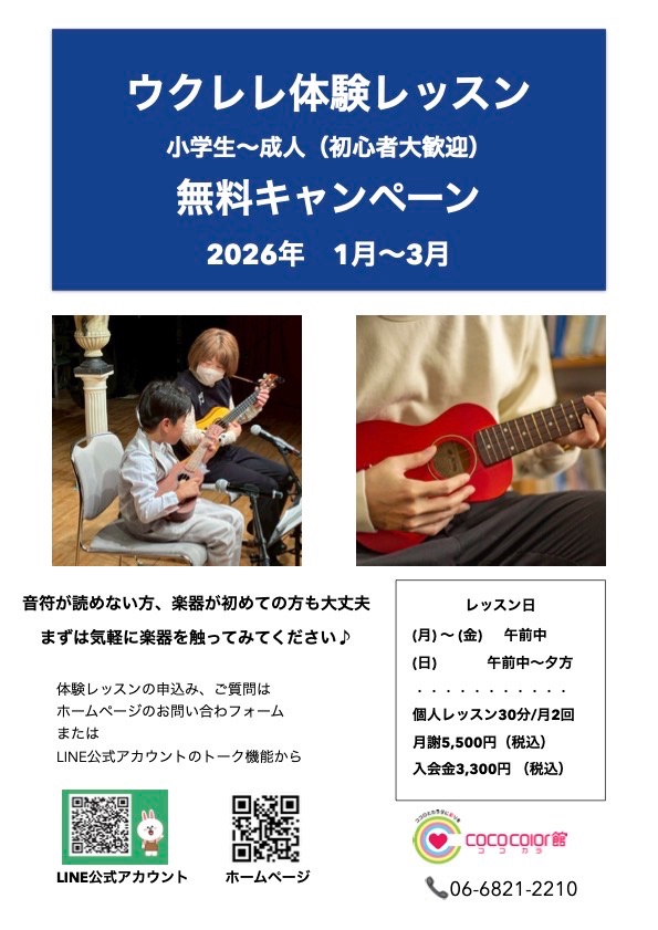 ただいま、ウクレレクラスでは、新年1月から3月まで、体験レッスン無料キャンペーン実施中です