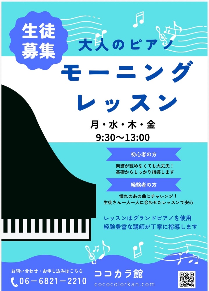 ご自宅で過ごす時間にピアノの時間を加えてみませんか。♪大人のレッスンは1回30分を月2回なので無理なく通っていただけます。まずは体験レッスンにお越しください。※体験レッスン:30分1000円※入会金3300円(税込)ご家族は半額